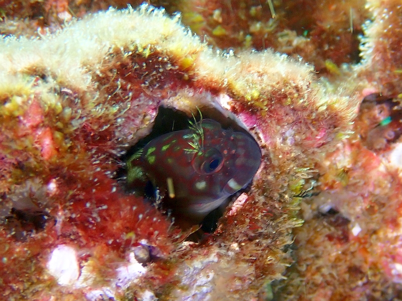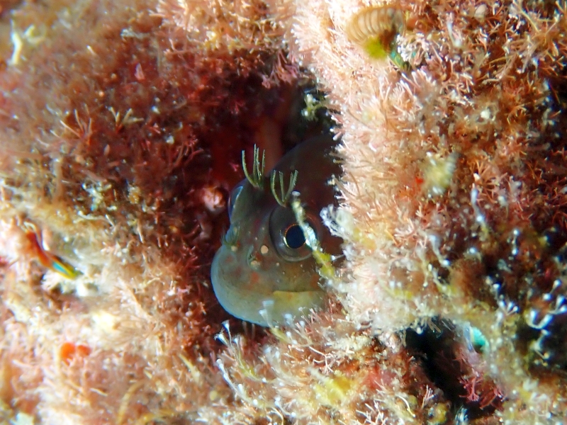 岩肌の穴やフジツボの殻に住み着いていて愛くるしい顔をしているのはタテガミカエルウオです。