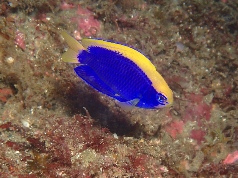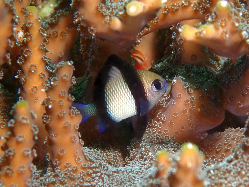昨年の高水温を生き延びた数少ないサンゴにフタスジリュウキュウスズメダイがやってきていました。