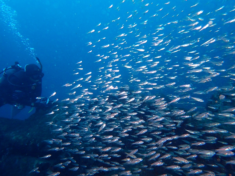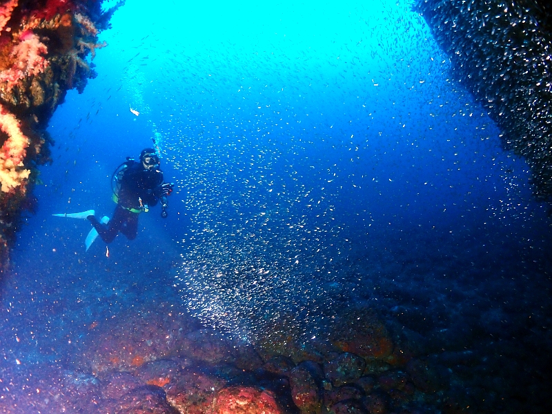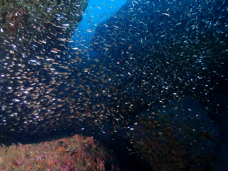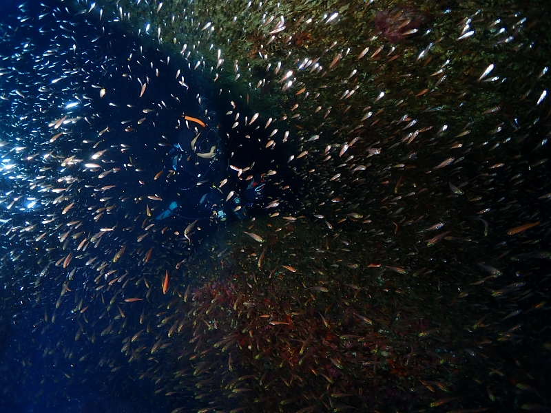 ここはキンメモドキだけでなくイッセンタカサゴの幼魚もいっぱい群れていてその群れの中を突っ切る快感。