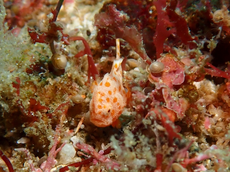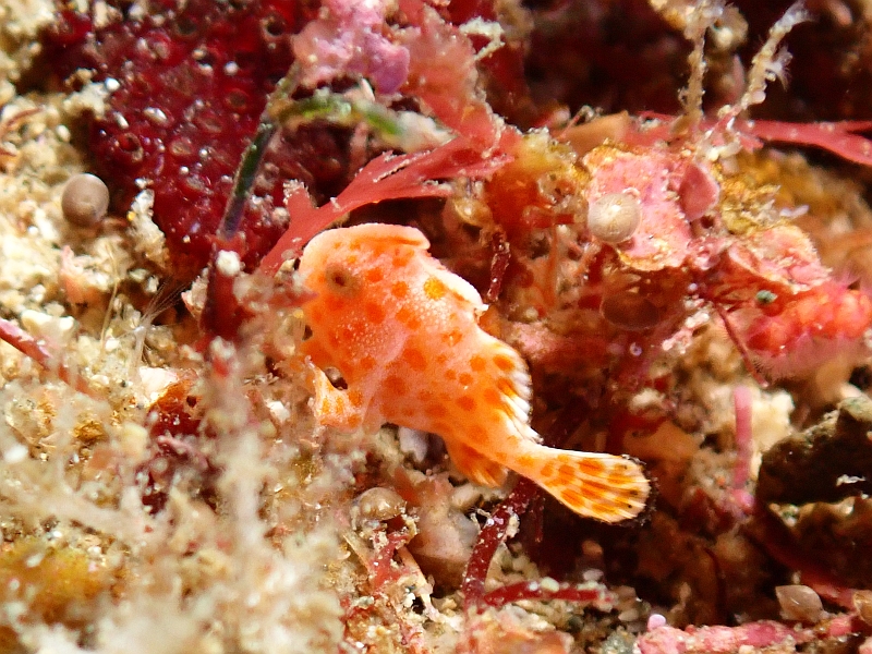この間見つかったオレンジ色のイロカエルアンコウの子供がいなくなったというので粘って探していたら、この子がいたんです。