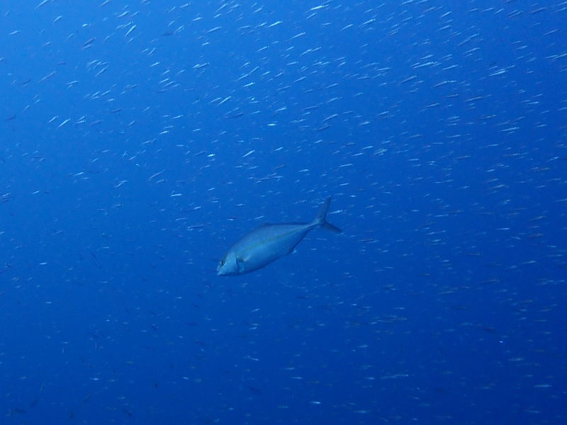 キビナゴにつきもののカンパチは今日も群れの中をうろついていました。