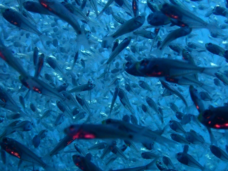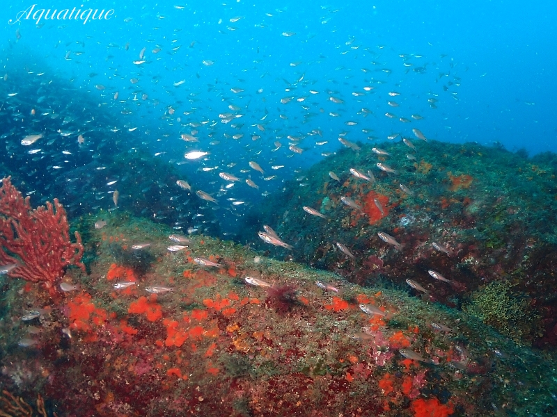 このイッセンタカサゴの群れの上にはキビナゴの群れがあってこちらはキラキラ。