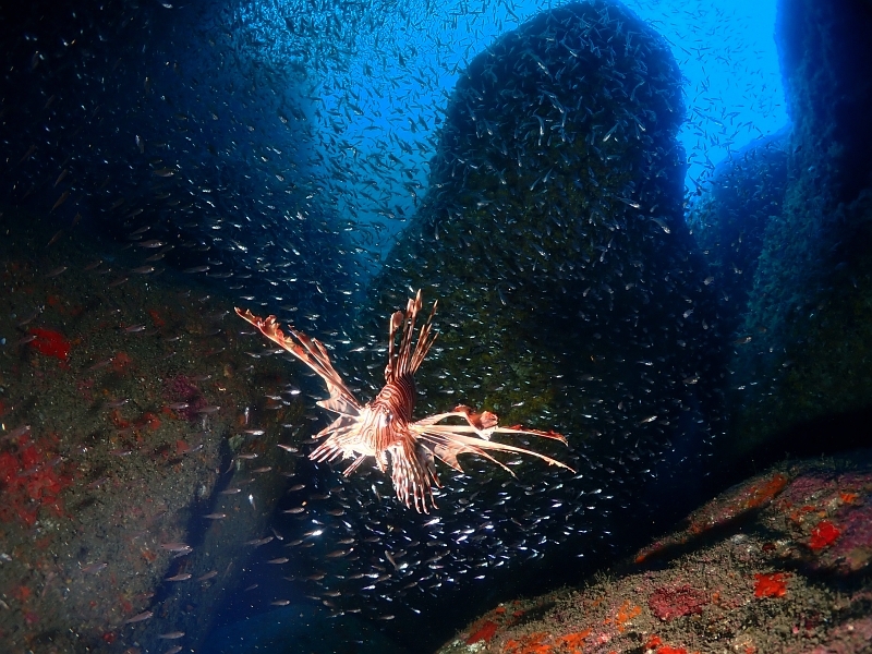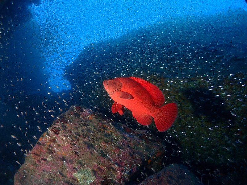 ハナミノカサゴなどの捕食魚が集まってきています。