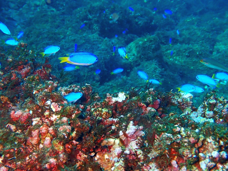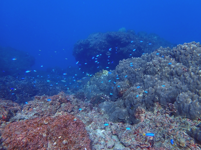 浅場のサンゴのガレ場にはソラスズメダイがいっぱいいます。