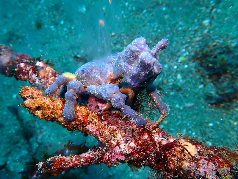カイメンをカラダ中にくっつけて擬態しているカイメンガニです。